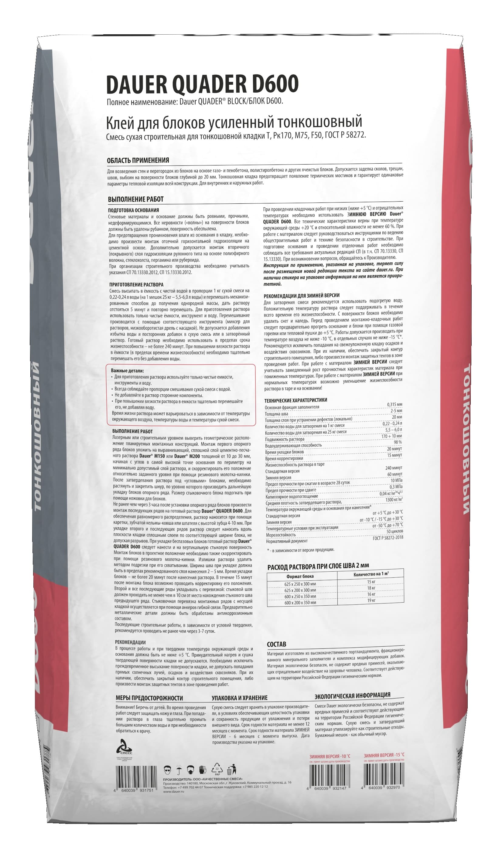 Клей монтажный тонкошовный Dauer QUADER BLOCK D600, 25 кг