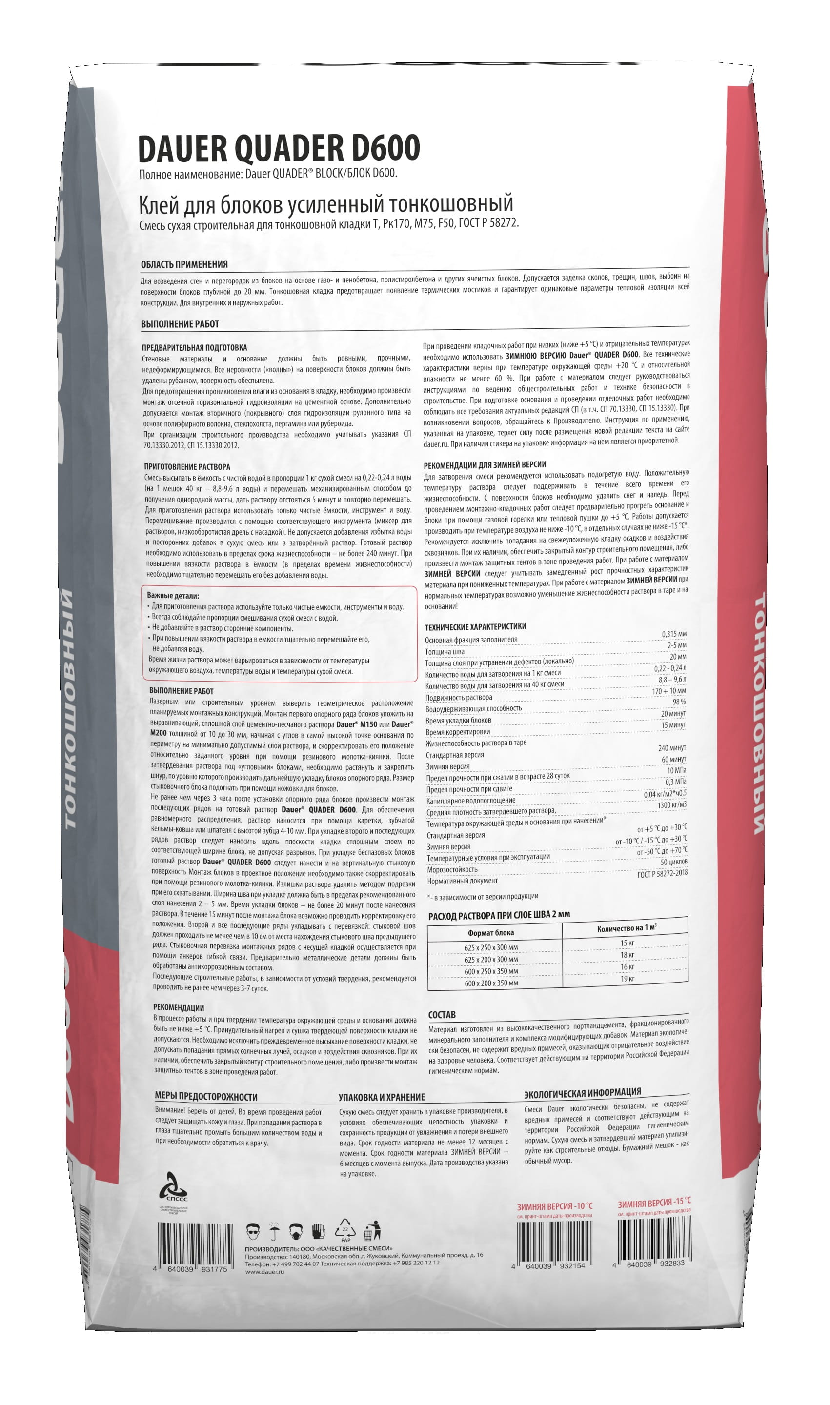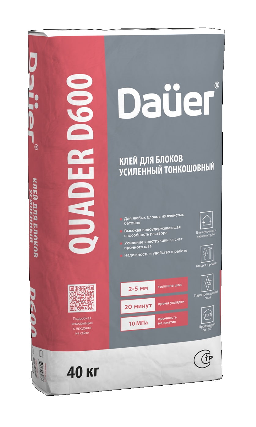 Клей монтажный тонкошовный Dauer QUADER BLOCK D600 в упаковке 40 кг представляет собой высококачественный состав для надежной фиксации строительных блоков. Он предназначен для создания тонких швов, обеспечивая прочность и экономию материала. Этот продукт идеален для профессионального и домашнего использования в строительстве, где требуется точность и долговечность соединений.