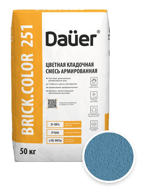 DAUER BRICK.COLOR 251 - это армированная цветная кладочная смесь синего оттенка в упаковке по 50 кг. Она сочетает в себе прочность, эстетику и удобство в использовании, идеально подходя для создания долговечных конструкций с выразительным внешним видом. Смесь разработана для профессионального и бытового применения, обеспечивая надежное сцепление и стойкость к внешним факторам.