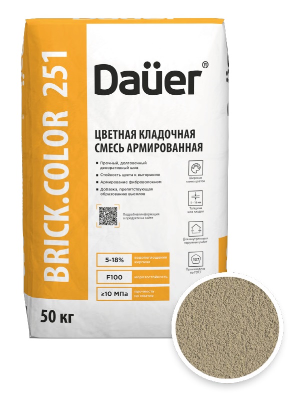 Цветная кладочная смесь армированная DAUER BRICK.COLOR 251 в оттенке слоновая кость представляет собой высококачественный материал для кладки, упакованный в мешки по 50 кг. Эта смесь сочетает в себе прочность, эстетику и удобство в использовании, идеально подходя для создания надежных и визуально привлекательных конструкций.