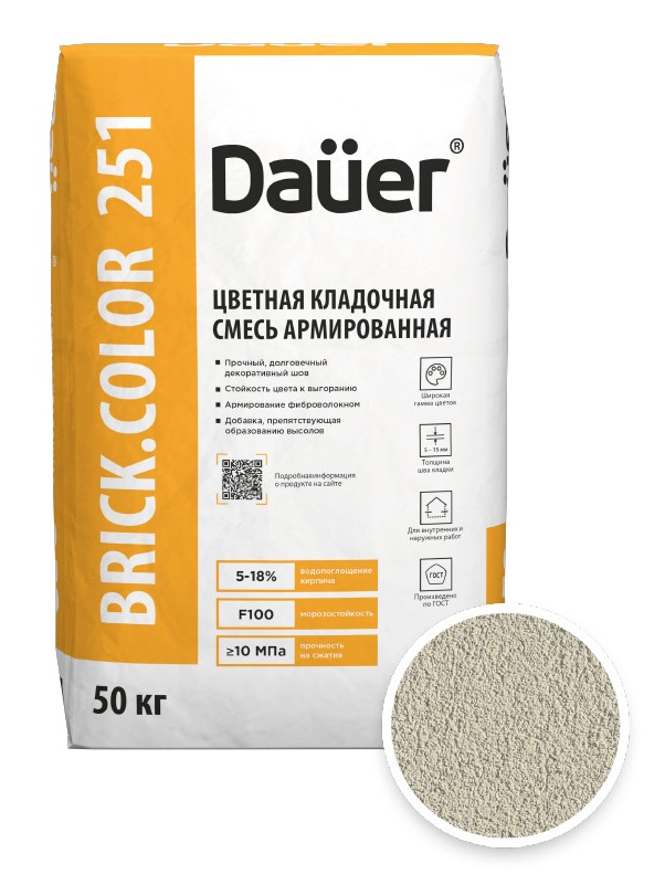 DAUER BRICK.COLOR 251 представляет собой высококачественную цветную армированную смесь для кладки в светло-бежевом оттенке. Упаковка 50 кг обеспечивает удобство в использовании для различных строительных задач. Эта смесь сочетает в себе прочность, эстетику и надежность, идеально подходя для создания долговечных конструкций с привлекательным внешним видом.